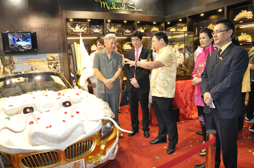 作为一种将中国传统的骨雕艺术融入世界,融入寻常百姓家的先驱及代表的广州龙发行,近十年来努力做了一系列的尝试,继2007年牙雕汽车《九九祥龙》之后,由广东著名牙雕民间艺人苏忠阳及19位雕刻工艺大师,通过历时三年零六个月合作完成又一纯手工的巨型骨雕作品——《飞龙》汽车惊艳亮世,作品全长5.2米、宽2.38米、高1.42米,重约3吨,是在一部全新的世界名车上镶嵌牦牛骨,并用黄金做装饰,雕刻细琢而成。这件作品是在传统的牙雕工艺手法上,首次运用三位一体雕刻手法,采用牙雕技艺中最高难度的平刻、立雕、浮雕、圆雕、镶嵌及缕空雕,整部车内饰,从方向盘、波棍、面板都采用传统牙雕技艺,精雕细刻而成,极具艺术感染力。